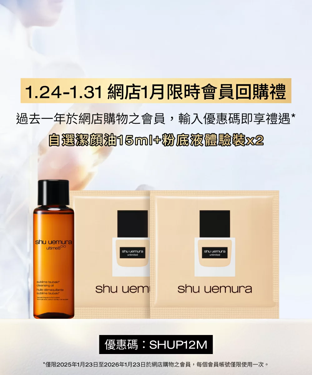 歡迎瀏覽https://www.shuuemura.com.hk/﹙「網站」﹚。使用網站前,請細閱條款及細則﹙「條款」﹚。網站由歐萊雅香港有限公司﹙「歐萊雅」﹚營運,地址為香港灣仔港灣道三十號新鴻基中心三十五樓。閣下使用網站,代表閣下接受條款,以換取歐萊雅提供之瀏覽權限。歐萊雅會不時修訂條款。因此,不論閣下瀏覽或使用網站,請繼續檢視條款。閣下在任何相關變更後使用網站,即同意遵守並受經修訂之條款約束。如閣下在任何時間不欲接受條款,閣下便不能使用網站。